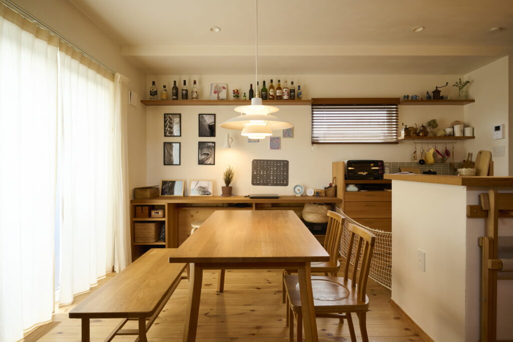 - キッチンと同じ木材で造作した食器棚やカウンター